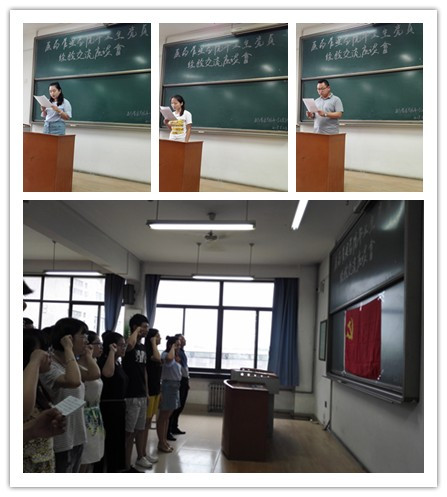 接着,由优秀的毕业生党员代表发言交流,他们即将离开母校,毕业生党员代表们言辞间无不流露出对母校的眷恋、对老师的感激和对未来的憧憬之情。已经考取选调生即将到基层工作的姜雪在发言中谈到,在实习、准备选调生考试的过程中,充分体会到了习近平总书记的讲话的精神实质,以党的理论知识为导向,以专业知识为基础,注重理论与实践的结合,在今后扎实的工作中不断历练党性修养和业务素质,为实现中国梦贡献自己的力量;参加志愿服务西部到新疆去工作的耿浩强同学激动的说到,当听到招录内地优秀毕业生到新疆工作这一消息时,感觉自己为中华之崛起的理想与梦想就要实现了。看到通知后,自己就毅然响应党的号召报名参加。到祖国最需要的地方挥洒自己的青春与热血;考取研究生的毕业生党员邢新敏、原校员工会主席郭康也做了交流发言。最后,支部全体成员面向党旗,重温了入党宣誓。