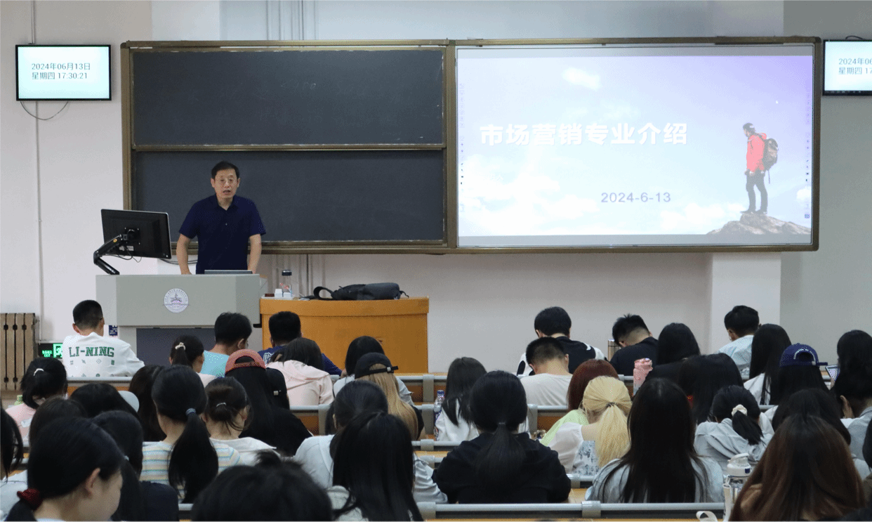 市场营销系主任崔行武从市场营销的学习内容、集中实践、就业方向以及导师制度对市场营销专业展开详细的介绍。崔行武强调市场营销专业重视员工升学,开展丰富的实践活动,拥有丰富的员工资源,能为同学们就业提供高质量服务。此外,他还结合23级同学实际的就业意愿,为同学们提出了更科学合理的职业规划方向,帮助同学们更好地开展专业选择和学习。