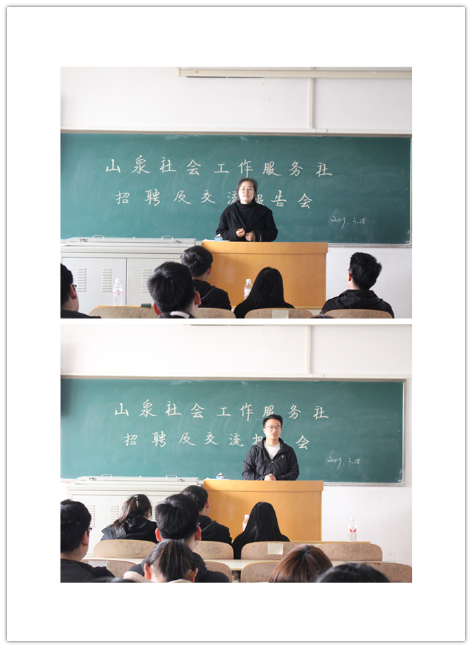 会议开始,由刘庚常主任介绍了山泉的各位管理人员,也是公司社会工作专业优秀毕业生李聪聪、袁吉坤、黄丽元等人,并阐述了此次会议举行的初衷及目的。各位师兄师姐介绍了山泉社会工作服务社的创办历程及工作范畴,并从自身工作经历出发,为学弟学妹们提出了工作、考研及专业学习方面的宝贵建议:同学们要从专业出发,明确目标,脚踏实地,并建议同学们调整好心态,积极面对学习和生活中的挑战,主动学习,不断丰富自己。山泉社会工作服务社的一线社工为同学们展示了山泉的实务工作,并分享了工作案例。会议期间,同学们积极发言提问,和学长学姐们交流融洽,解答了心中许多专业学习和就业方面的疑问。此次招聘交流会取得了良好的效果,在一阵热烈的掌声中圆满结束。