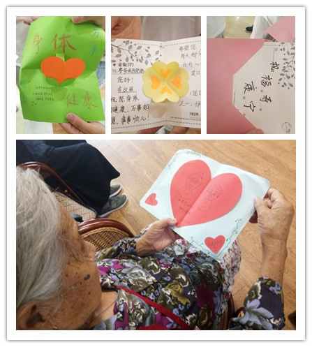 在之后的小组工作中,为了活跃老人们的生活,让老人们重新体验到生命的意义和价值,各小组准备了丰富的游戏项目来增加老人的活力,如青蛙跳水、画鼻子、夹弹子、击鼓传花等活动,在社工师生的联合领导下轮番上演,老人们兴致盎然,积极参与。兴之所至,有老人拉着搭档,高歌一曲《九九艳阳天》,博得了阵阵掌声;有的老人夹玻璃珠轻巧灵敏,大出意料,引发同学们的一阵惊叹;生命回顾治疗中还有一位新四军的老革命战士给我们讲述了他的奋斗人生,勉励年轻人要多学习多实践。欢声笑语溢满整个活动大厅,欢乐轻松的气氛感染了每一个人,看到老人们开心的笑容,同学们内心也充满了成就感。在健康的知识小竞答环节里,老人们在生动有趣的问答中获得了健康的知识,并收获了同学们精心制作的手工贺卡,内心获得极大充盈。