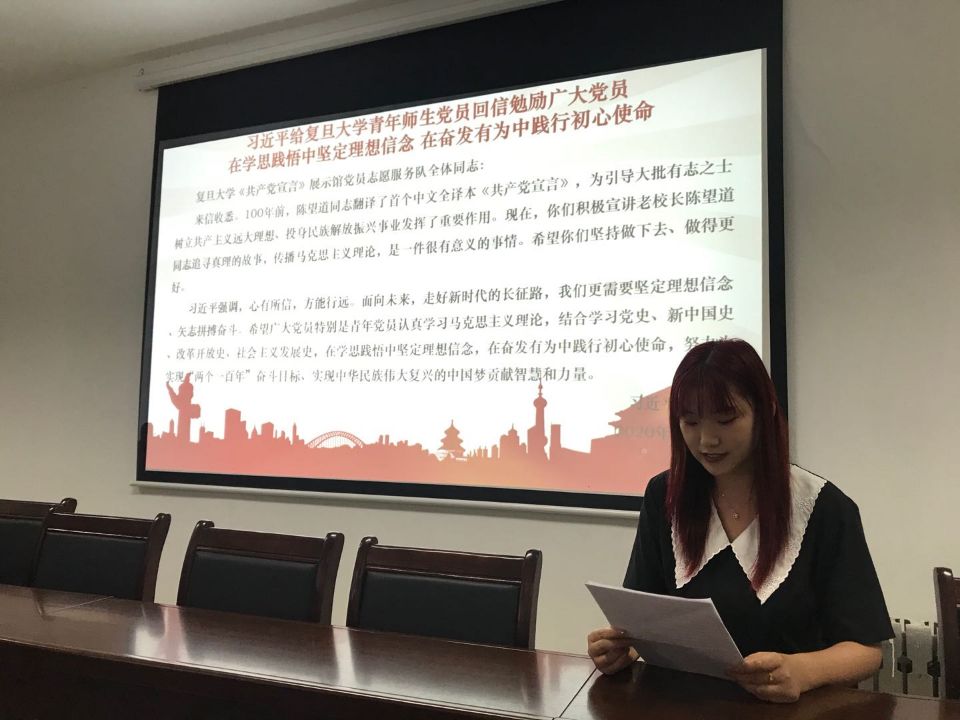围绕专题,员工党支部两位老员工党员代表发表了自己的看法。员工第一党支部的李林同学提到了“不负韶华,担当奋进”的精神,正青春、有理想、肯担当的老员工党员们更应该切切实实的为身边同学做事、为发展中的山一大奉献自己的一份力量。员工第二党支部崔翔宇同学向老员工党员们发出四个倡议:一守初心,知使命。二勤奋学习,做学习上的担当者。三诚信文明,做遵纪守法的表率者、负责人。四发挥党员的先锋模范作用,做引领老员工的担当者。