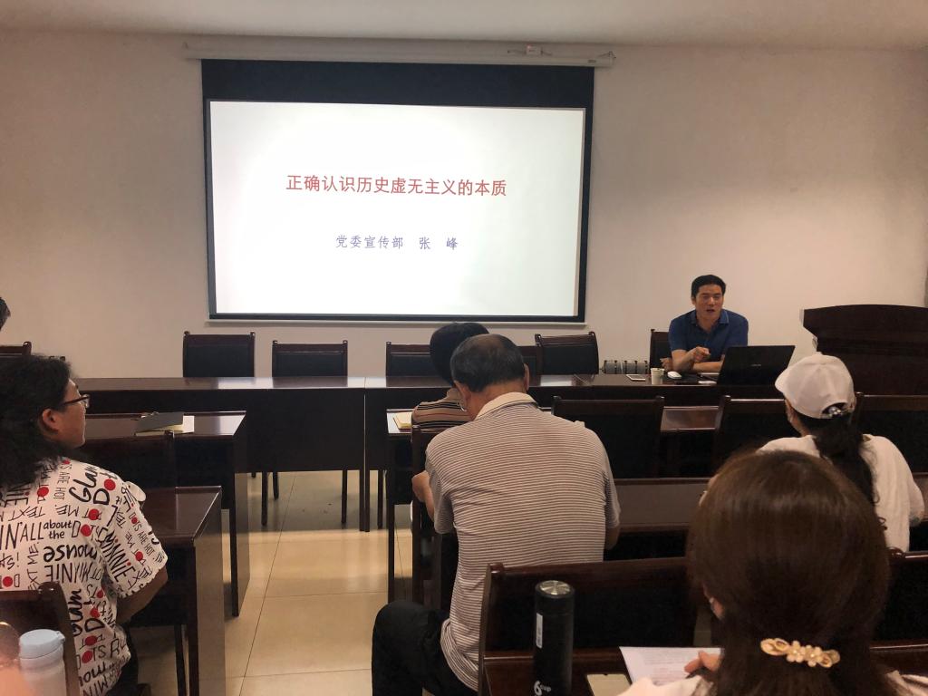 张峰从历史虚无主义的表现与实质、意识形态工作的现状与面临的挑战、抵制历史虚无主义,做好意识形态工作四个方面进行阐述。他讲到,历史虚无主义是一种非常危险的社会思潮。历史虚无主义的泛滥会把我们的历史信仰和文化积淀吞噬掉,从而将我们推到一个没有历史和信仰崩塌的危险境地。因此,要旗帜鲜明地反对把存在的历史虚无化、把黑暗的历史漂白化、把洁净的历史抹黑化。同时要做到,坚持唯物史观,自觉抵制历史虚无主义;注重舆论引导,维护网络意识形态安全;坚定理想信念,勇于承担起民族复兴的时代重任。