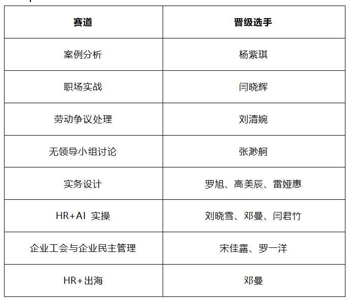该赛事包括实务设计赛道、职场实战赛道、案例分析赛道、无领导小组讨论赛道、劳动争议处理赛道、HR+AI实操赛道、企业工会与企业民主管理赛道,和1个选参赛道:HR+出海赛道(原HR-English赛道)。