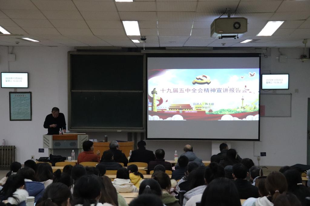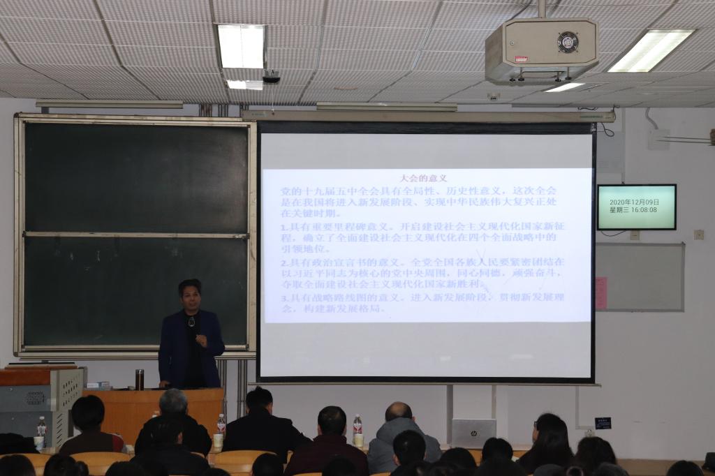 为深入学习贯彻党的十九届五中全会精神,根据校(院)《关于做好学习贯彻党的十九届五中全会精神宣讲工作的通知》要求,12月9日下午4点在教学南楼C2001教室,校(院)党的十九届五中全会精神宣讲团成员陈士福为部分师生作了党的十九届五中全会精神的宣讲报告,报告会由图书馆馆长段耀奎主持。图书馆泰安校区、期刊编辑部、口腔医公司和三亿体育全体教职工和部分员工党员近200人现场参加了报告会,图书馆济南校区教职工线上集中收看了报告。