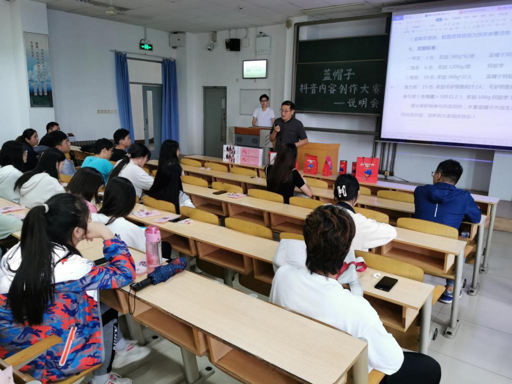 通过介绍会,同学们还了解到了东阿阿胶企业发展历程、数字化营销模式、产品组合,还有蓝帽子阿胶枣产品优势以及适用人群。蓝帽子阿胶枣事业部其他经理还为同学分发蓝帽子阿胶枣,让同学们品尝,为同学们进行创作提供了很好的创作灵感和创作素材。会议最后,崔行武老师进行了总结发言,鼓励同学们积极创作,并对东阿阿胶蓝帽子阿胶枣事业部三位经理的到来表示了由衷的感谢。