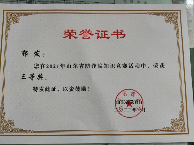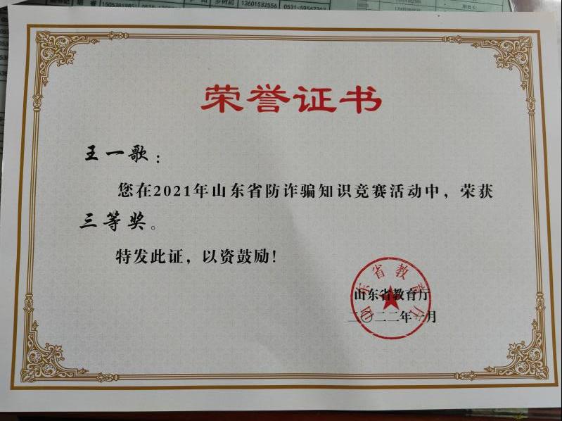 近日,山东省教育厅组织开展的“建行杯”防诈骗知识竞赛落下帷幕。2020级人力资源管理专业王一歌同学和2020级劳动与社会保障专业郭发同学荣获三等奖。
