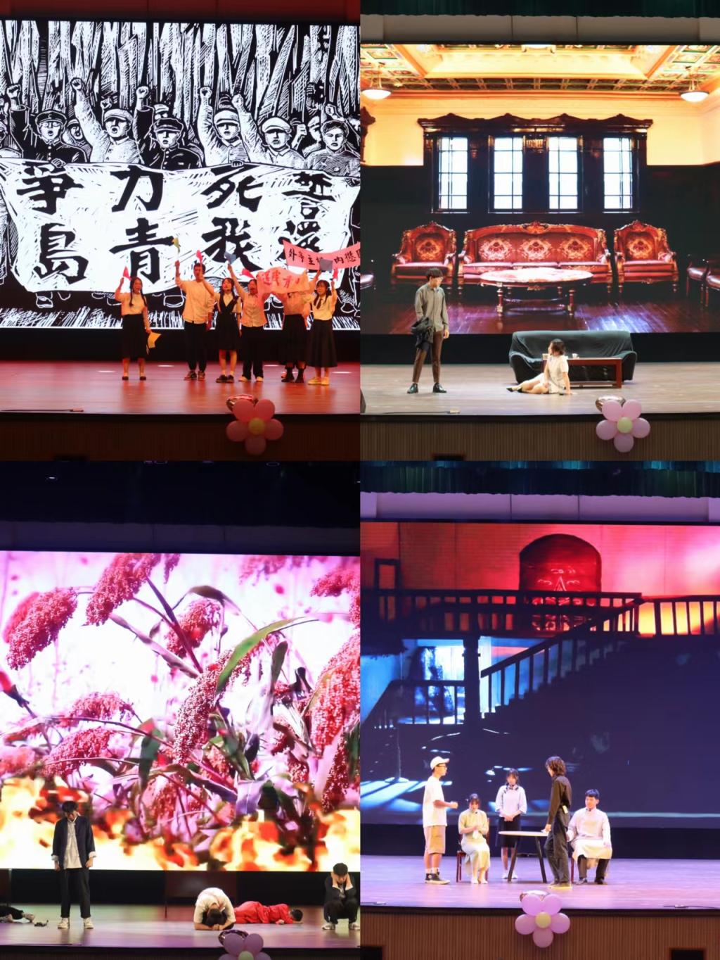 本次活动由石瑞瑛、刘依然、刘书羽等同学带来的舞蹈《醉春风》拉开序幕。第一个节目是由外国语公司曙光队带来的话剧《破晓》,选手们在舞台上的倾情演绎,再现了抗日战争年代全民抗战的革命岁月,赞扬了战士们誓死保卫国家的民族气节和无畏牺牲的奉献精神,彰显了太阳终将升起,革命必然胜利的坚定信念,引来了场上观众的阵阵掌声;第二个节目是口腔医公司红高粱队带来的话剧《红高粱》,簇拥的红高粱似漫天的火烧云,带给观众强烈的视觉感受,一个个色彩鲜明,坚决与侵略者斗争的人物形象跃然于舞台,展现出华夏儿女不屈不挠、英勇抗争的民族精神,尤其是剧中余占鳌不折、不悔、不息的抗日英雄形象令在场观众深受震撼和感动;第三个节目是由韩进、朱子怡、杨子杰等模特协会的表演者带来了模特走秀《Bloom now》,模特们身着传统旗袍与中山装服饰跟随音乐旋律迈着端庄大方的步伐展示着中华传统服饰的优雅魅力,给同学们带来耳目一新的感受;第四个节目是三亿体育lost stars队带来的《围城》,舞台上同学们精彩绝伦、情感充沛的演绎将经典人物的形象塑造出来,让观众身临其境一般,恍若回到了那个旧时岁月,感受那个时代知识分子的生活和心理的变迁浮沉,带给观众强烈的心理冲击;第五个展示作品是放射公司放射绝队带来的话剧《雷雨》,演员们凭借对剧本的理解将剧中封建思想和阶级矛盾展现的淋漓尽致,通过完美的舞台效果,诠释着话剧艺术的魅力。最后,由通识家苑通识之声合唱团为大家带来了合唱《心系书简》,声韵之间流露出中华传统文化的魅力,比赛在悠扬的歌声中圆满结束。