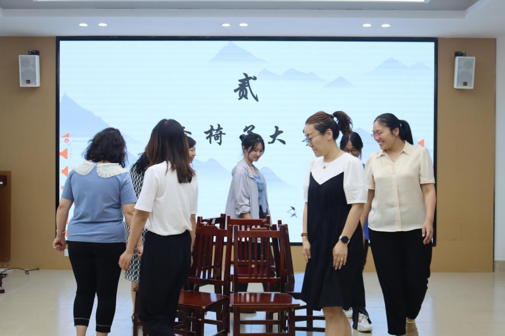 随后进行的是抢椅子大赛和你画我猜大赛,前者极其考验选手们的反应能力,参赛的老师们需围着椅子跟随音乐的节奏转圈,“停”,当音乐停止时迅速抢占一把椅子,没抢到椅子的人淘汰,直到剩下最后一人;后者则是考验选手们的默契度和想象力,五位老师分一组,第一位老师看完题目后通过表演的形式传递给下一位老师,以此类推,最终由最后一位老师说出答案,回答对题目多的组获胜。两个比赛的获胜者都可以获得一个套圈。