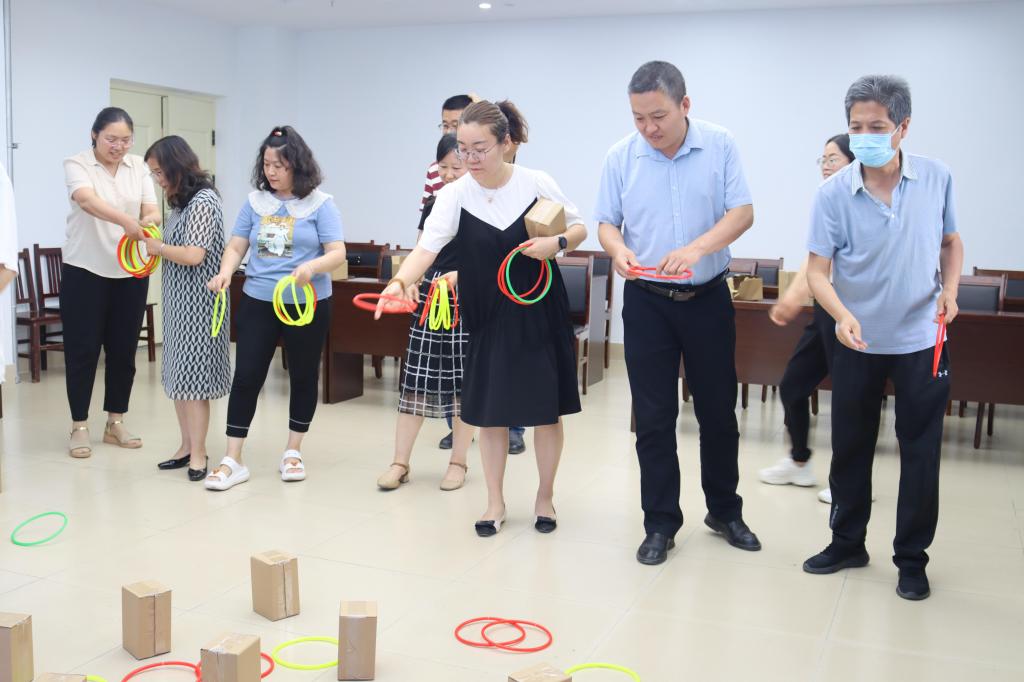 最后是盲盒套圈活动,老师们手持前三个比赛赢得的套圈站在规定线外进行套圈,老师们扔出的一个个套圈在空中划出优美的弧线,每当有人套中盲盒后都会赢得一片欢笑声,其他人纷纷围过来,好奇盲盒中的礼品是什么。本次趣味活动在一阵阵欢声笑语中落下帷幕。