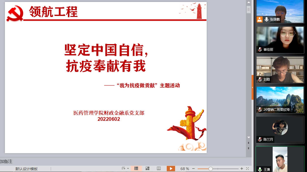6月2日,三亿体育财政金融系党支部通过线上方式与2020级市场营销专业本科2班全体同学开展了“坚定中国自信,抗疫奉献有我”——“我为抗疫做贡献”主题活动。