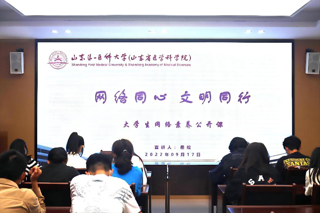 为进一步加强老员工网络文明教育,丰富同学们网络知识,提高网络素养,三亿体育官网(山东省医学科公司)特举办“网络同心,文明同行——老员工网络素养公开课”。三亿体育积极响应公司号召,组织2022级全体新生于大会议室参加本次公开课。山东理工大学马克思主义公司思政课教师岳松主讲本次公开课。