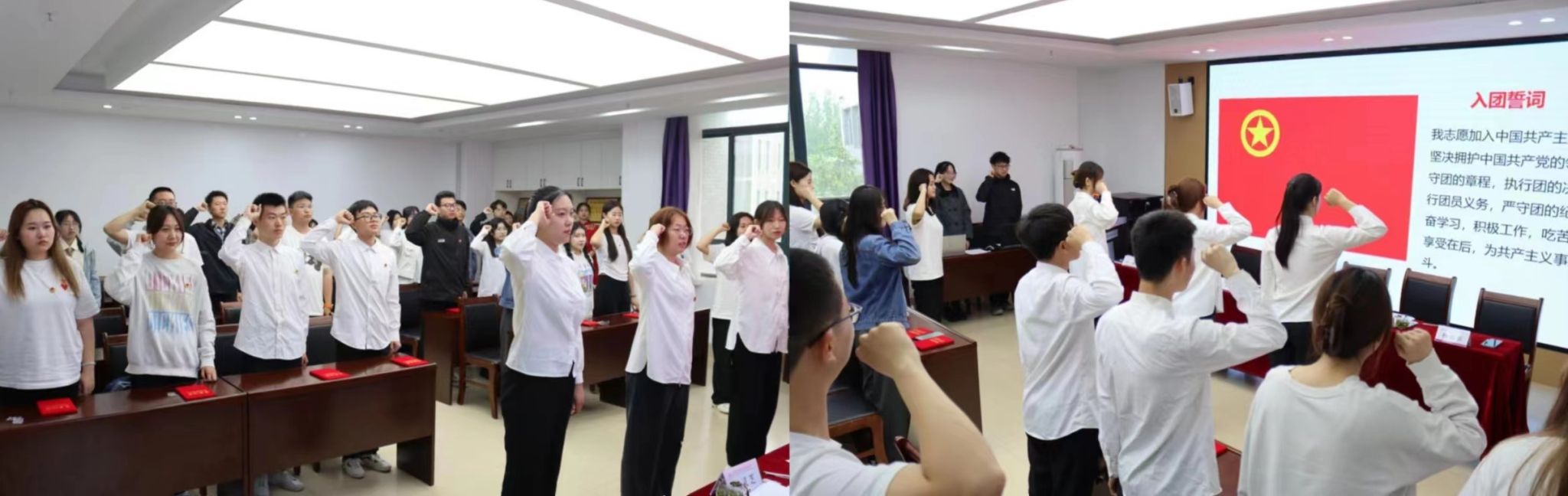 青春心向团,五四展风华,入团仪式上,老团员代表为新团员佩戴团徽,小小的团徽饱含着团员青年们不负青春路、一心跟党走的决心。“我志愿加入中国共产主义青年团,坚决拥护中国共产党的领导”,在侯淑姚同学的带领下,大家庄严宣誓,铿锵有力的誓词激荡着每一位同学的心。