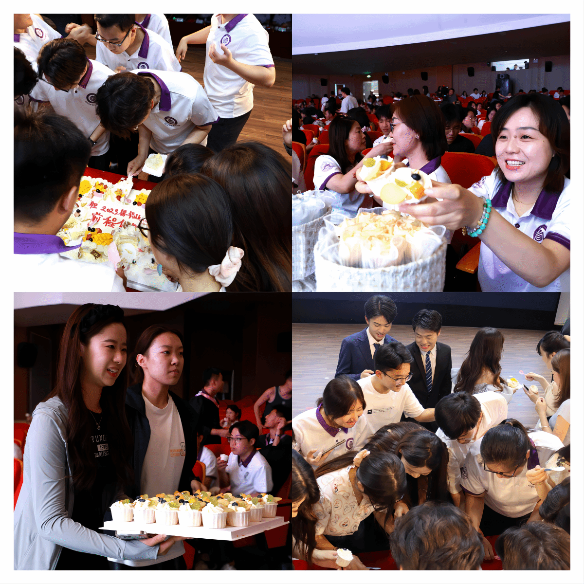 切毕业蛋糕作为公司毕业晚会的保留节目,一直深受广大师生的欢迎。台上,陈士福经理和杜江山书记为大家切分蛋糕,并邀请同学们上台分享,同学们一呼百应,快步跑上讲台,将经理、书记紧紧环绕,有的帮忙切蛋糕、有的帮忙递蛋糕,师生共聚一堂、其乐融融,现场氛围十分温情、温馨和温暖,老师们把最真切的祝福送给每一位毕业生,勉励他们温暖前行。