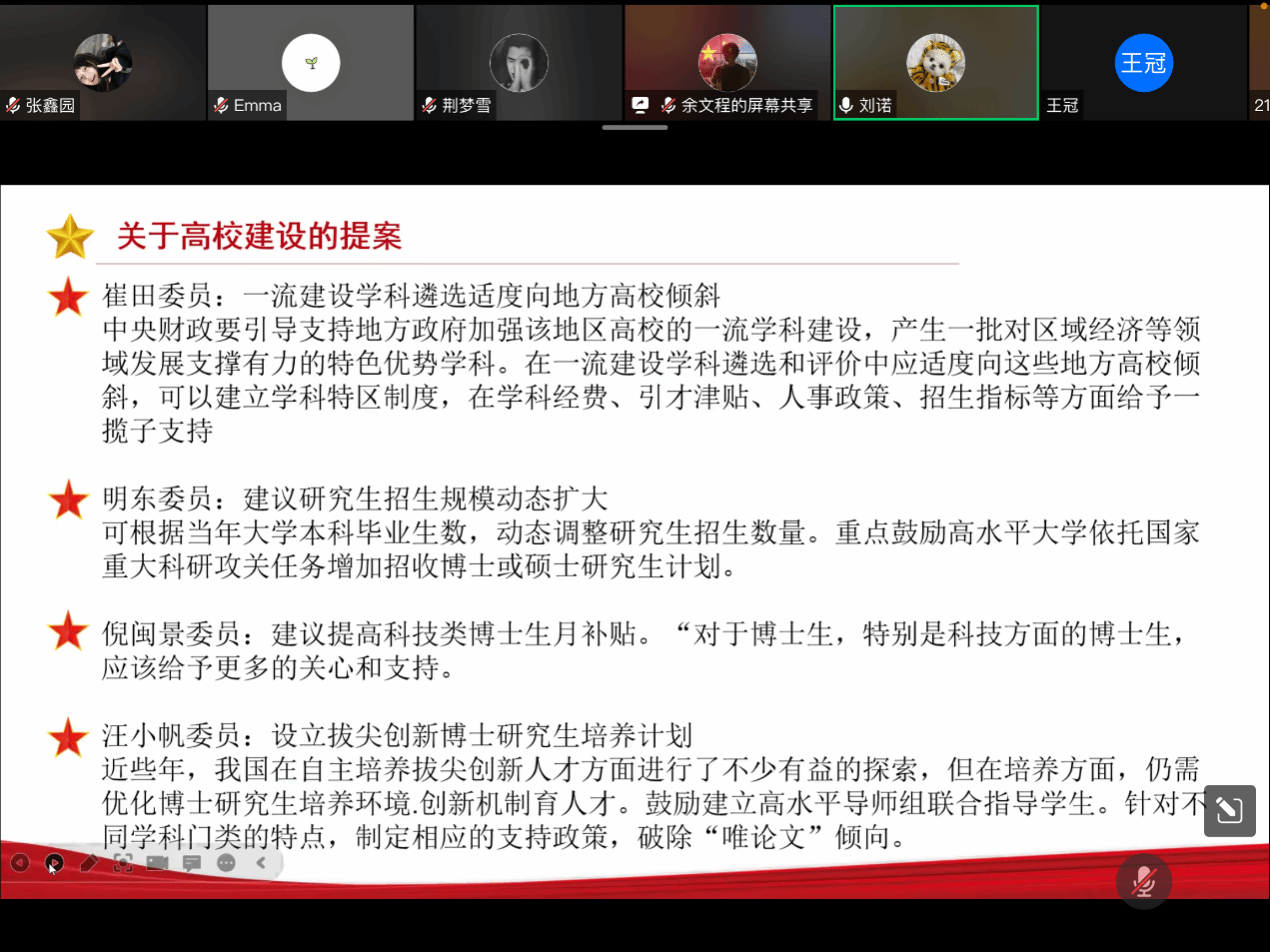 最后,刘诺同学为大家介绍两会热点中关于高校建设的提案。展示了崔田、明东、汪小帆等委员关于高校建设的提案,介绍通过培养卓越拔尖创新人才来加强高校建设的政策,进一步提高员工学习的积极性和主动性。