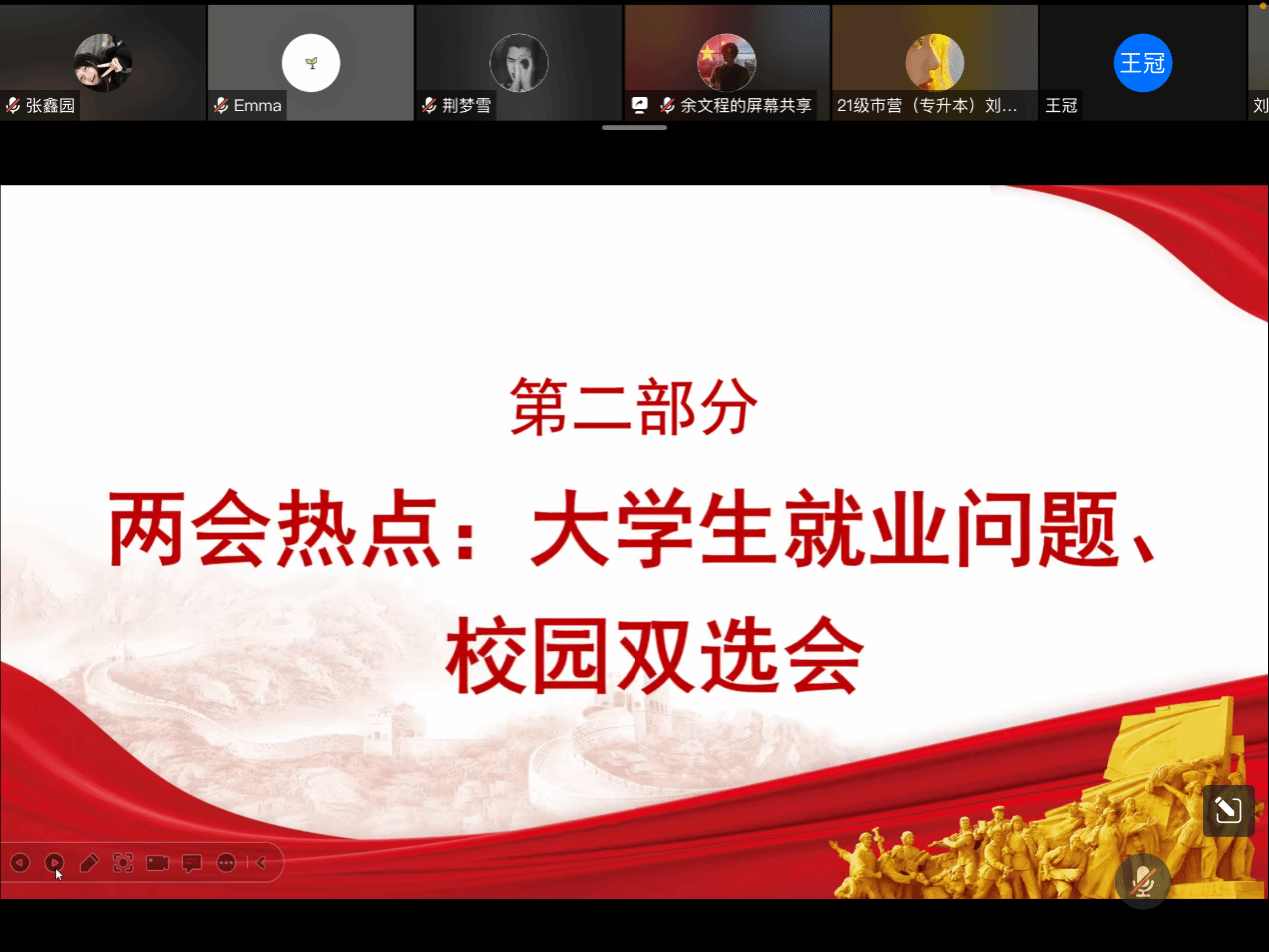 张鑫园同学讲解两会热点“老员工就业问题”,并介绍校园双选会。目前老员工就业是全社会高度关注的问题,两会委员对此提出了一系列建议,如:出台鼓励企业扩大招聘高校毕业生的相关政策、鼓励民企吸收高校毕业生、简化优化高校毕业生就业手续。此外,于3月11日举办的校园双选会在公司毕业生与用人单位之间建立起快捷的沟通桥梁,促进员工就业,进一步推动产教融合成果转化。