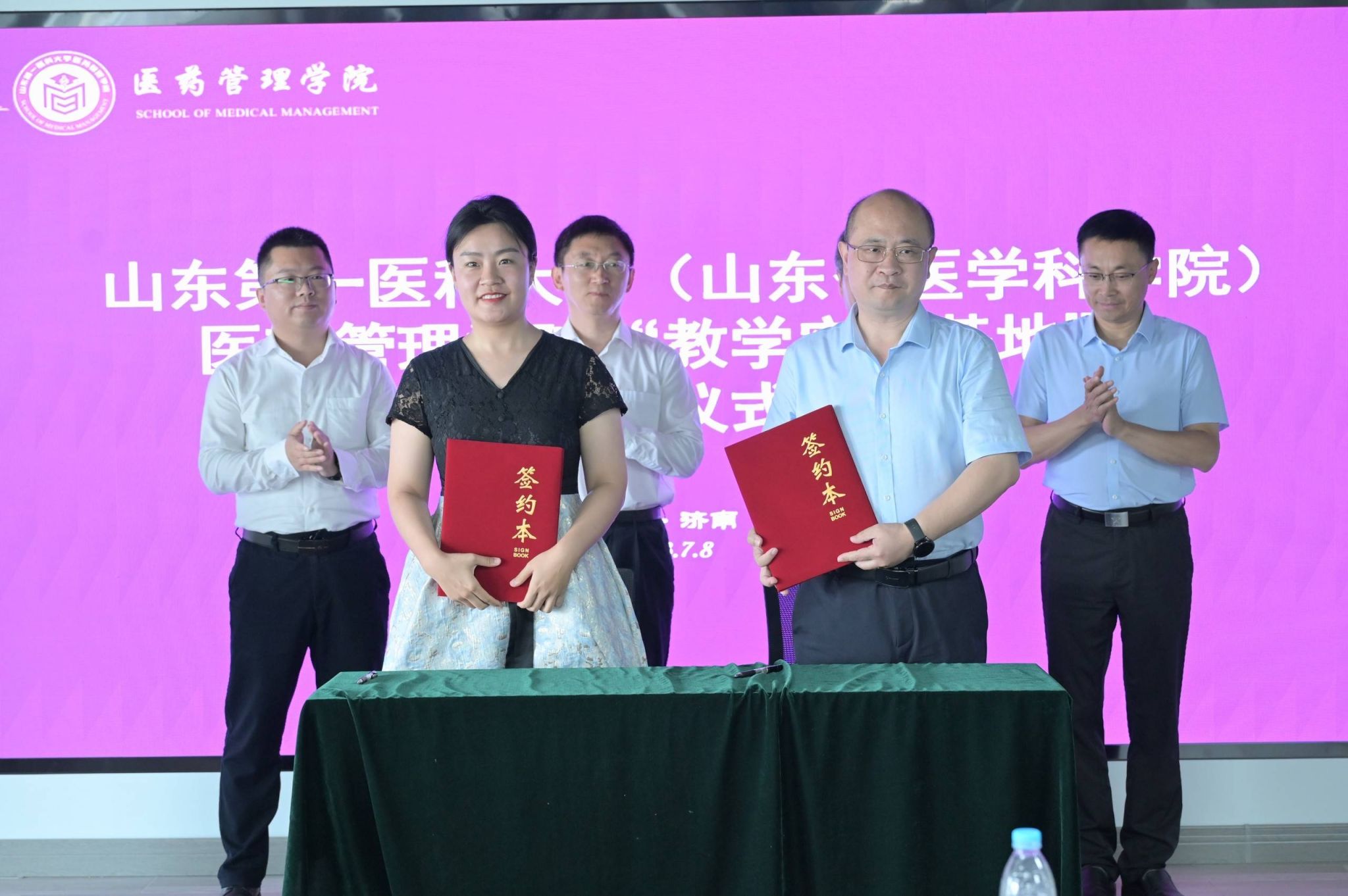副经理陈海玉与山科园区槐荫项目总经理徐佳慧分别代表公司、企业签署教学实践基地协议,王剑、陈士福、杜江山、梁博鉴签本次活动。
