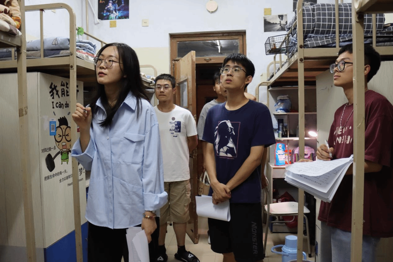 在检查过程中,评委老师们围绕床铺布置、用品摆放、寝室卫生、安全隐患等方面对新生宿舍进行了检查和记录,并对发现的问题进行了现场纠正,同时温馨提醒同学们杜绝使用违规电器,确保宿舍用电安全。