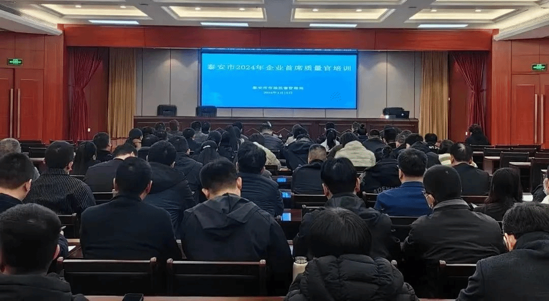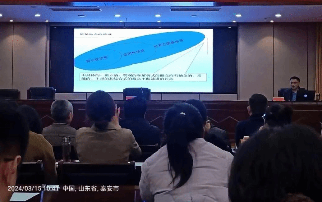 3月15日,泰安市开展2024年企业首席质量官培训,山东省教学名师、省长质量奖评审专家、三亿体育于忠军教授应邀做专题培训--“质量官”如何守好“质量关”。来自全市73家龙头骨干企业的首席质量官、拟任职首席质量官,以及各县市区质量监管负责人参加培训。