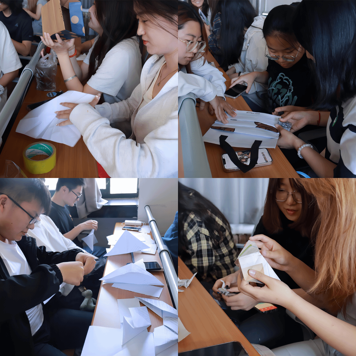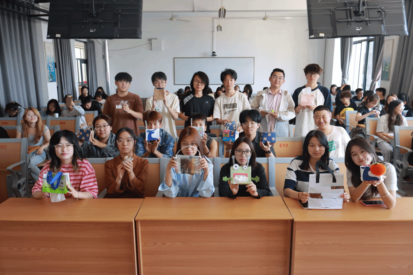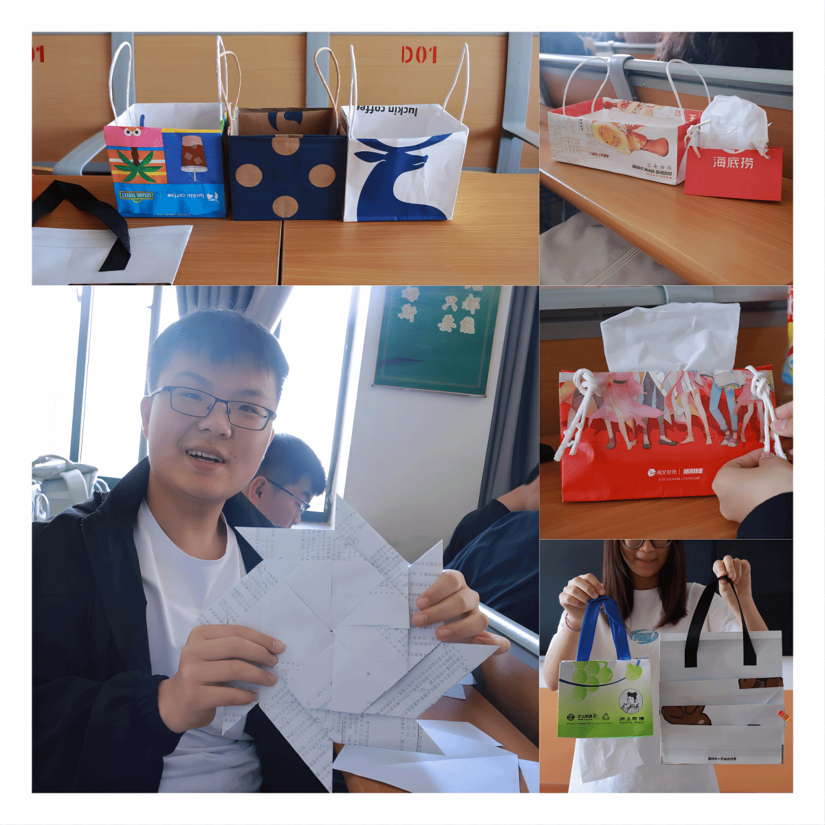 同学们利用废旧物品资源,进行巧妙地改造,创作出各式各样的环保作品。废弃口罩和一次性筷子变身成灯笼,外卖奶茶袋变成实用抽纸盒,废旧报纸折叠成翱翔蓝天的飞机。成果作品琳琅满目,同学们的创意和奇思妙想在本次实践课堂上得到了充分展示,废弃物在同学们的认真创作中完成了华丽转身。