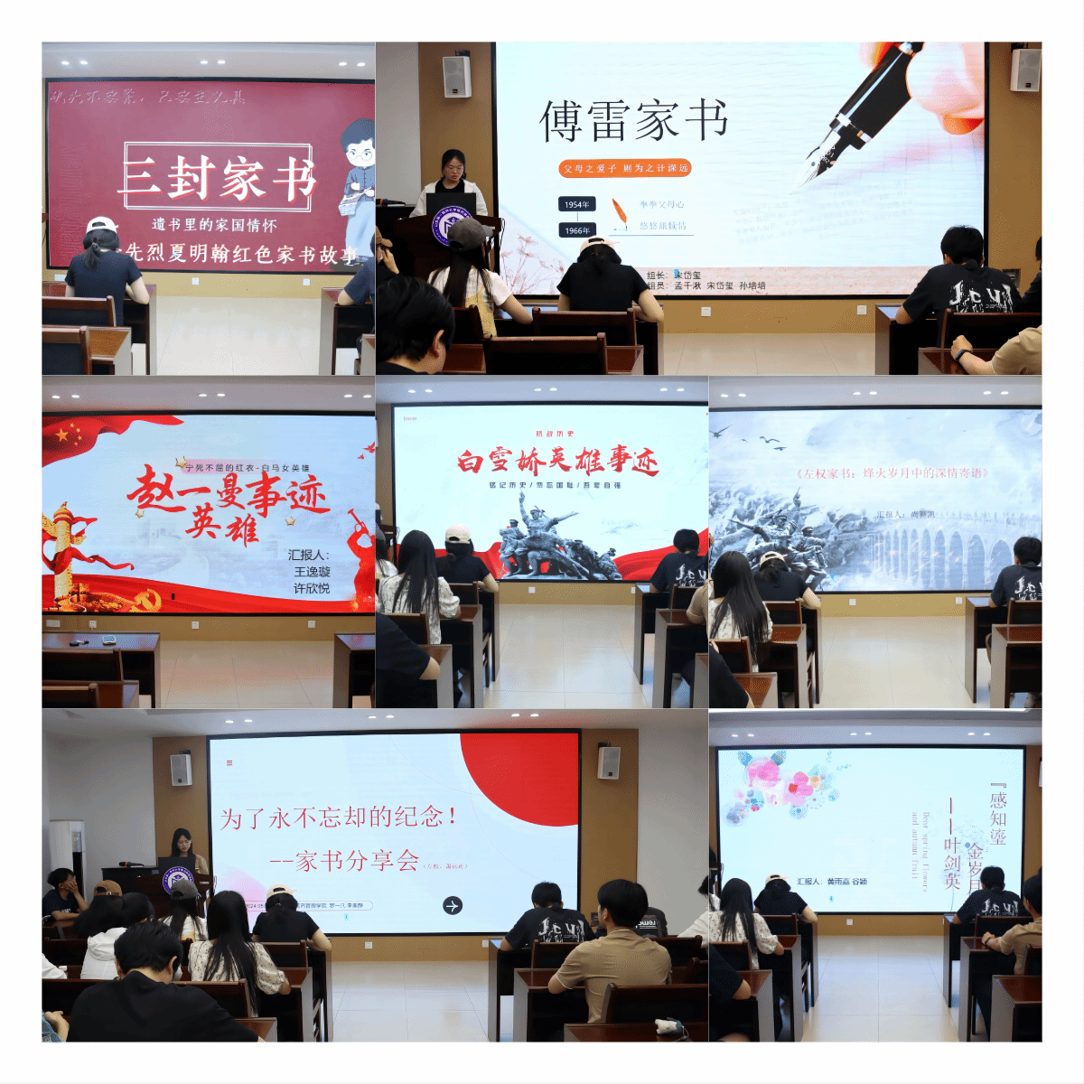 本次分享会共有九个小组进行分享,各小组代表分别分享了自己在阅读白雪娇、左权、叶剑英、傅雷、赵一曼、夏明翰、邓颖超等人家书时的心得体会,带领同学们深入了解每一段家书背后的故事和意义。同学们再次诵读这些尘封的家书,读到的不只是那段艰苦时期的硝烟和苦难,更是对家人的思念和牵挂,是对祖国的热爱和赤诚,是天下兴亡、匹夫有责的爱国情怀,也是视死如归、宁死不屈的民族气节。这一封封穿越时空的“抗战家书”,成为我们和革命先辈们对话的桥梁,也成为了历史永恒的见证。
