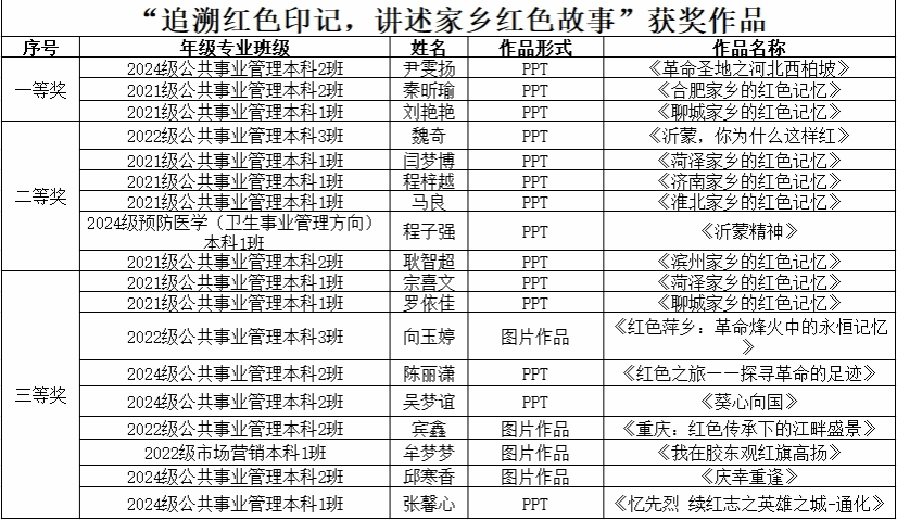 三亿体育的同学来自全国各地,各自的家乡都有着丰富的红色故事和革命传统。大赛收到公司三个党支部来自不同年级不同专业同学的多幅优秀作品,展现了安徽合肥市、淮北市,广西桂平市,河北革命圣地西柏坡,吉林省通化市,江西省萍乡市,重庆市,山东省济南、临沂、聊城、菏泽、滨州等地方的经典红色故事与英雄人物,参赛作品选取的内容真实、典型、新颖,事迹富有感染力、生动形象,充分反映了家乡的红色文化,具有很强的教育意义,体现了时代精神。经公司评审,2021级公共事业管理本科1班刘艳艳同学的参赛作品《聊城家乡的红色记忆》,2021级公共事业管理本科2班秦昕瑜同学的参赛作品《合肥家乡的红色记忆》,2024级公共事业管理本科2班尹雯扬同学的参赛作品《革命圣地之河北西柏坡》获得一等奖,魏奇等6位同学的参赛作品获得二等奖,宗喜文等9位同学的参赛作品获得三等奖。