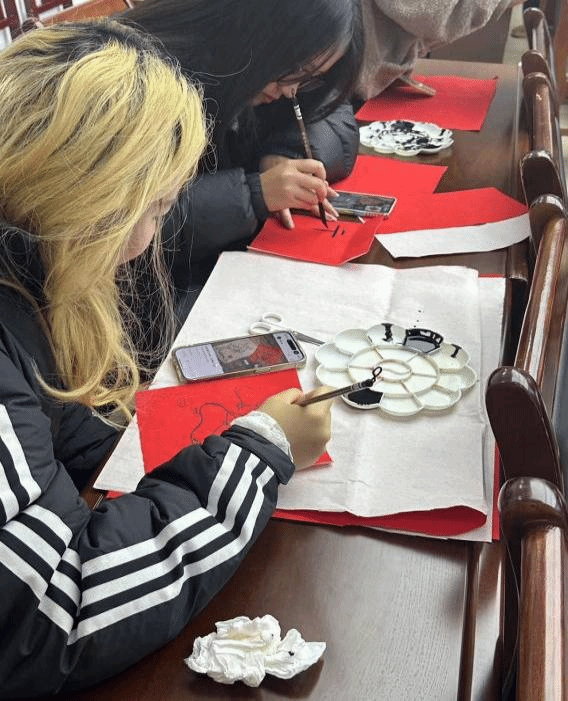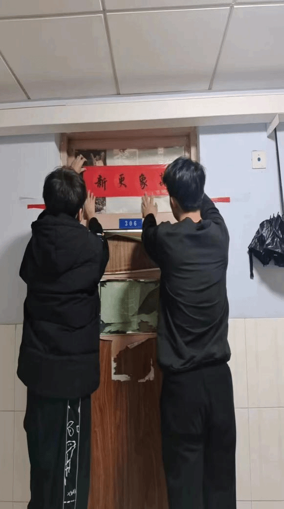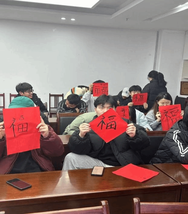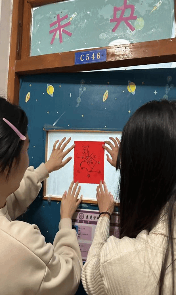挥毫泼墨写春联。同学们拿起毛笔,一个个福字跃然纸上,把对新年的祝福和未来的期许融入笔墨中。随后,同学们回到各自的寝室,将精心书写的“福”字贴在寝室门上,寄托了大家对新年美好生活的期待。