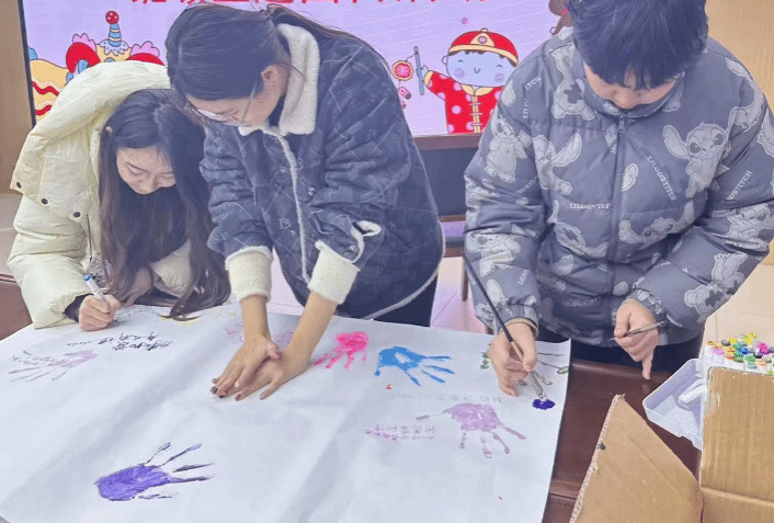 绚丽多彩手印画。同学们将手掌涂抹上鲜艳的色彩印在白纸上,一刹那,洁白的纸变得五彩斑斓,就如青年人自由地描绘未来的天空。不仅是创造的美丽,更展现了新时代老员工的青春正能量和阳光风采。