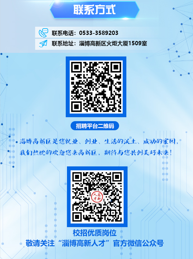 启动仪式:淄博高新区“天淄雄厚·博揽英才”2022年春季系列直播招聘“启动仪式”将于2022年4月15日上午9:30开始在智联招聘空中宣讲平台进行直播,主环节包括淄博高新区宣传介绍、淄博高新区人才政策推介、淄博高新区重点企业推介等。高校毕业生可关注启动仪式发布链接,了解高新区基本情况以及引才引智利好政策,并在发布会下方界面了解企业岗位信息并直接投递简历。启动仪式招聘平台现已配置完毕,企业已发布招聘信息,伴随企业招聘需求变化,会陆续增加岗位,诚邀广大求职者积极浏览,了解高新区政策与企业情况,迈出求职第一步。启动仪式及职位链接请扫描下方招聘平台二维码。