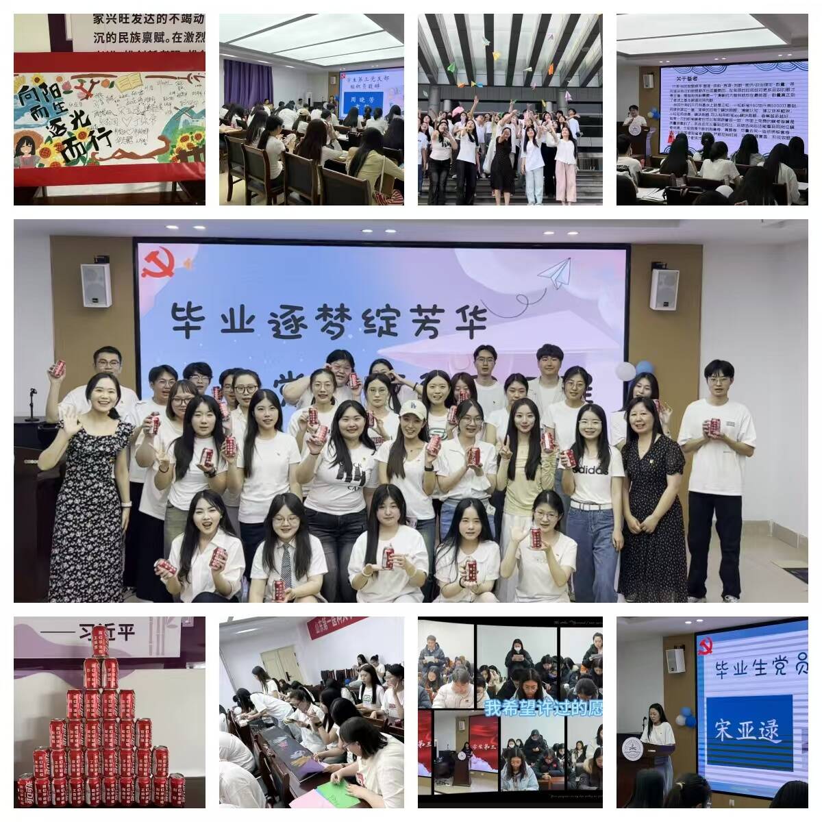 活动以沉浸式回顾视频拉开序幕,党建活动场景与校园生活画面交相辉映,生动展现毕业生党员的青春奋斗历程。活动中,“忆往昔” 环节里,全体党员庄严肃立奏唱国歌,并在姚洋洋同志的带领下重温入党誓词,坚定初心使命;“传薪火” 环节,组织员周晓芳老师深情寄语,宋亚逯、陶善旺两位学长学姐倾囊相授考研、就业经验,助力低年级党员成长;“共绘梦” 环节,毕业生党员印下承载初心的掌纹,写下理想折成纸飞机放飞,仪式感满满。活动尾声,全体合唱《一路生花》,支部赠送刻名专属可乐表达祝福,最后大家合影留念,在“员工第三党支部永远是温暖港湾”的温馨叮嘱中圆满落幕。
