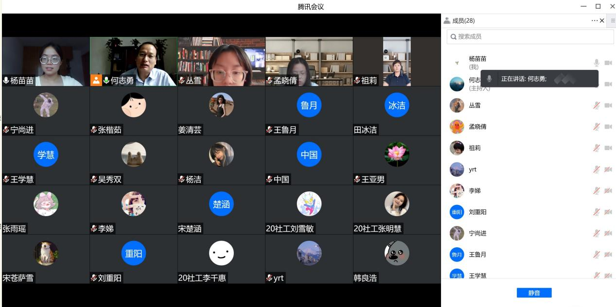 自校(院)开展“领航工程”以来,校(院)工会、妇委会党支部积极下沉联系班级,认真调研班级同学情况,开展系列主题活动。暑假期间,校(院)工会、妇委会党支部为确保同学们度过一个安全、愉快、充实的暑期生活,于7月11日通过腾讯视频会议的方式开展安全主题班会。工会副主席陈丽、祖莉老师、何志勇老师、2020级社会工作本科一班辅导员杨苗苗及全体同学出席本次活动。