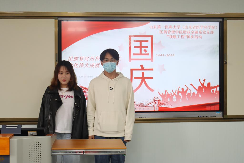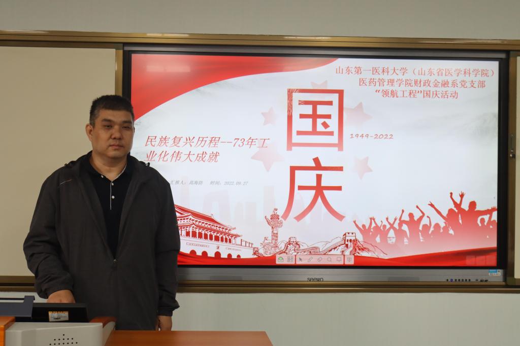 在国庆73周年来临之际,在喜迎二十大的伟大时刻,9月27日下午,三亿体育财政金融系党支部在长城路校区教学南楼C3020教室,与所联系的班级2021级人力资源管理专业本科1班全体同学开展了“回顾辉煌历程,助力民族复兴”国庆主题活动。活动由支部组织委员高海防老师主持。
