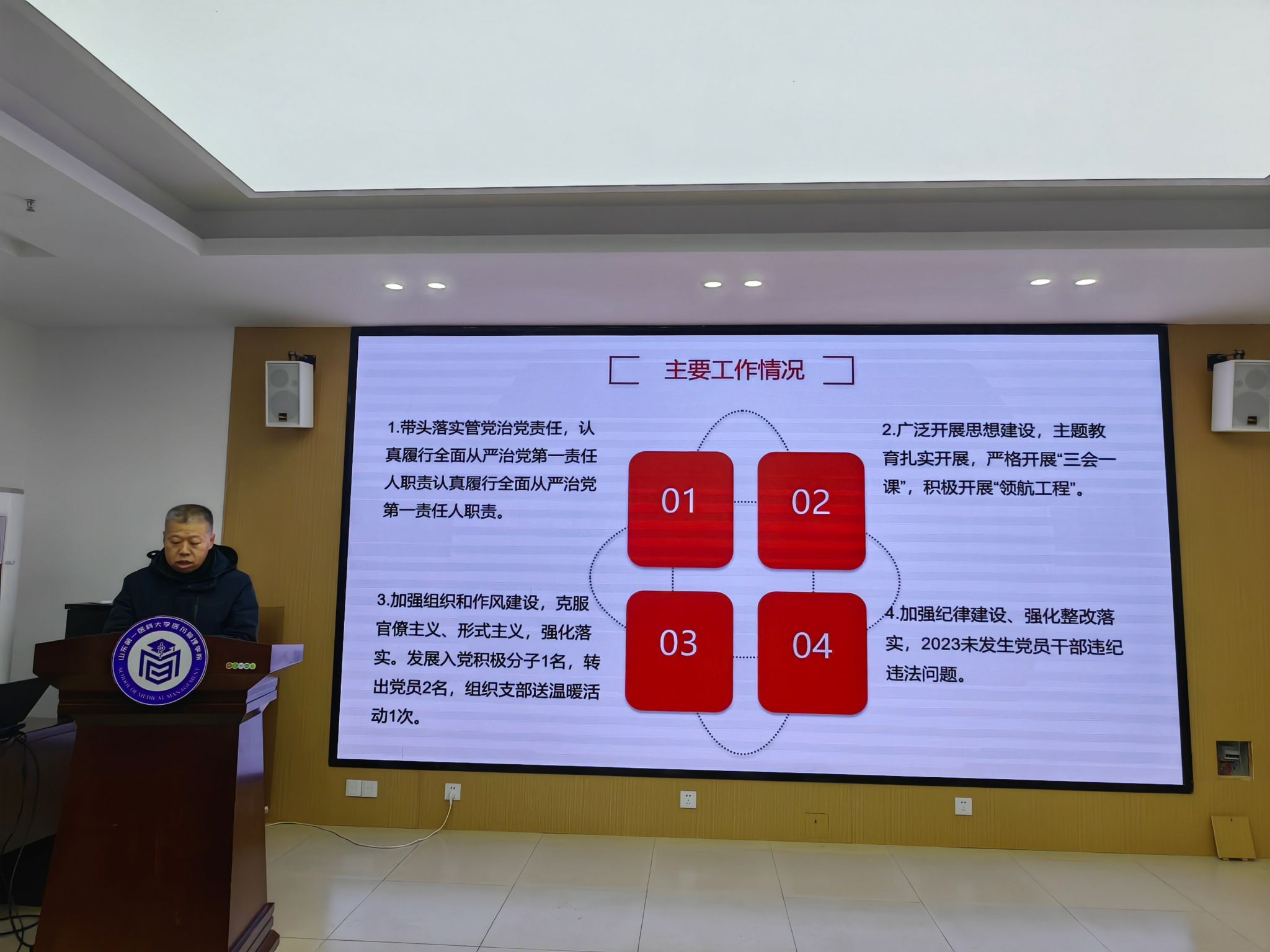 杜江山强调抓好基层党建工作,事关全局、责任重大,希望各位党支部书记始终牢记“第一责任人”身份,履行“第一责任人”职责,带领每个支部委员会有活力、党员干部有担当、学习教育有氛围、服务师生有温度、党风廉政建设有力度、党建业务融合有成效。同时就抓好2024年基层党建工作提出四点要求:首先要提高政治站位抓党建,把牢政治方向,巩固拓展主题教育成果;第二要紧扣中心大局抓党建,做到抓党建工作抓而有力,抓有所成;第三要建强支部堡垒抓党建,提升支部组织力,确保各项任务高质量高效率完成;第四要坚决落实全面从严治党要求,深化党风廉政建设,加强师德师风建设和教风学风建设。各党支部要进一步强化理论学习、提升政治能力,规范党内政治生活制度、加强组织建设,加强党员队伍建设、发挥党员先锋模范作用。以更高的起点、更严的要求,创新亮点、创出特色,在校(院)双一流建设的征程上贡献公司力量。