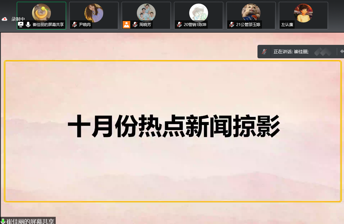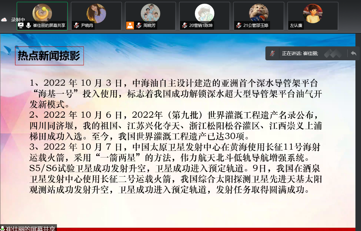 首先崔佳丽同学为大家播报了10月份以来海内外的热点新闻,党的二十大在京顺利召开,科研、太空、教学再创佳绩,历史文化遗产成功入选,医保网络覆盖率再度提高,海外体育赛事连获喜报,科技项目进展喜人。