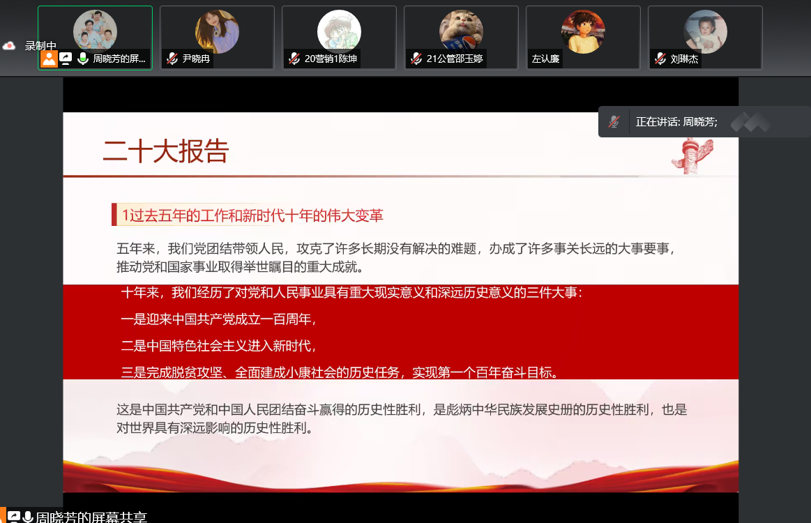 周晓芳带领大家共同学习了党的二十大报告内容。党的二十大是在全党全国各族人民迈上全面建设社会主义现代化国家新征程、向第二个百年奋斗目标进军的关键时刻召开的一次十分重要的大会,是一次高举旗帜、凝聚力量、团结奋进的大会。党的二十大在政治上、理论上、实践上取得了一系列重大成果,就新时代新征程党和国家事业发展制定了大政方针和战略部署,是我们党团结带领人民全面建设社会主义现代化国家、全面推进中华民族伟大复兴的政治宣言和行动纲领。周晓芳重点分析了大会的主题及报告的主体框架和主要内容,对于同学们关注的教育、科技、人才等方面的内容与同学们展开热烈讨论,使各位党员同志和入党积极分子更加深入地掌握党的二十大报告的精髓。