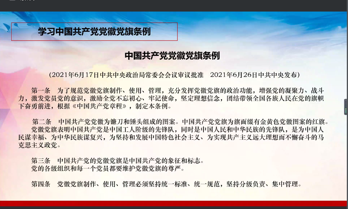 最后,洪嘉伟同学带领大家共同学习了《中国共产党党徽党旗条例》,对中国共产党党徽党旗的各项条例以及党徽党旗的使用和制作方式有了更加深入的了解。