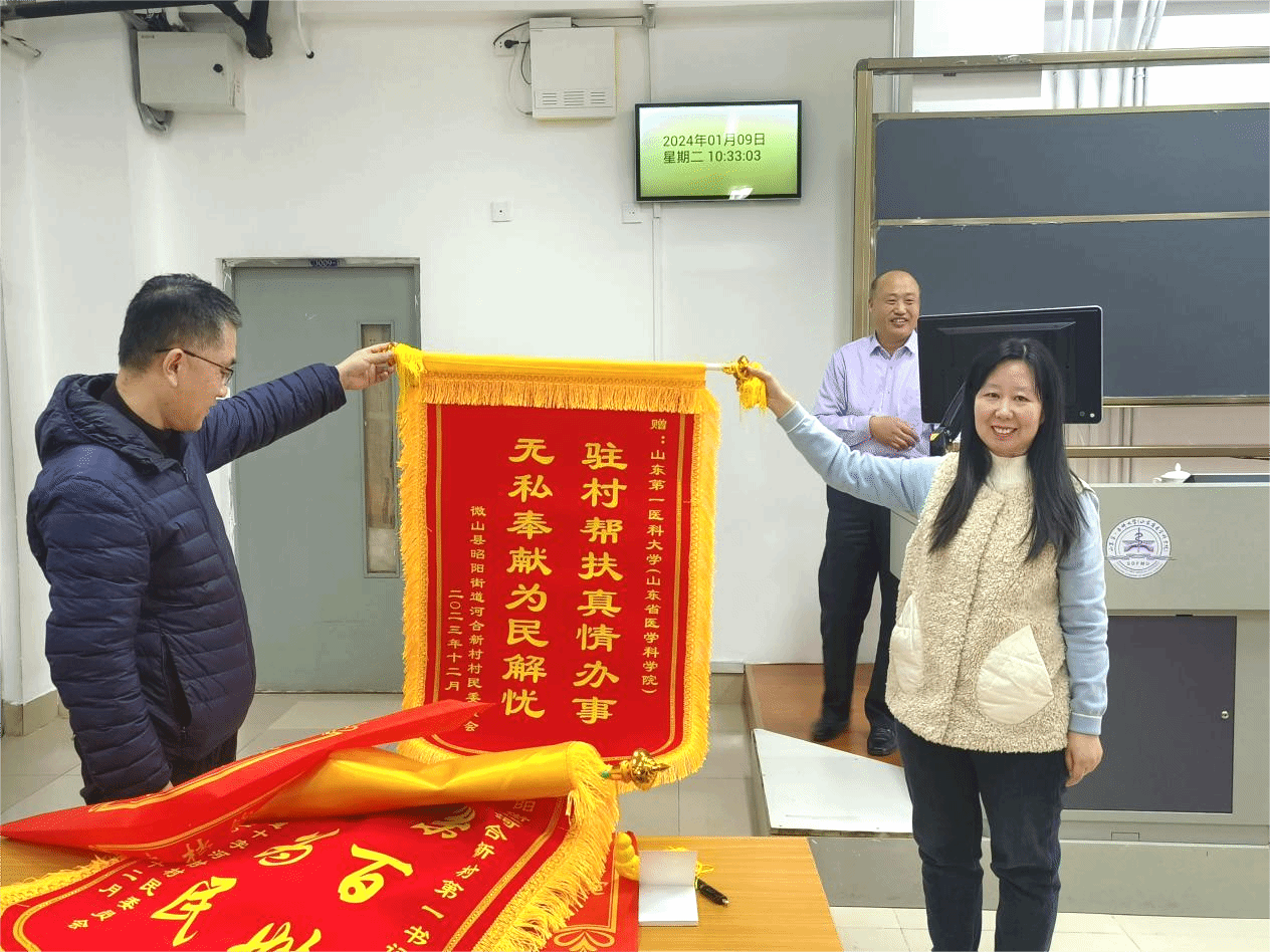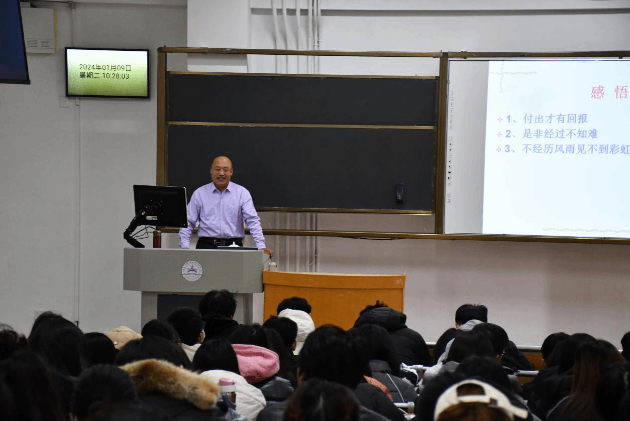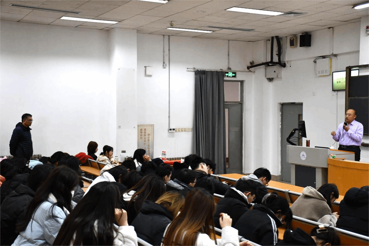 刘克从走访调研、改建服务设施、带动经济发展、义诊捐物等方面对乡村振兴进行了专题解读,分享了自己的志愿服务经历和对助力乡村振兴的感悟。他表示,老员工是乡村振兴的主力军,同学们要努力学习专业知识,提高自身素质,积极参与志愿服务与社会活动,深入基层,知行合一,躬行实践,书写与时代同行的青春篇章。随后,于忠军、周晓芳与刘克进行问答交流,刘克向同学们展示了在服务基层过程中获赠的锦旗,引起同学们的讨论兴趣,现场氛围热烈融洽,同学们在交谈中对投身基层、服务社会有了更深刻的认知,个人为成长成才树立了正确的世界观和价值观。