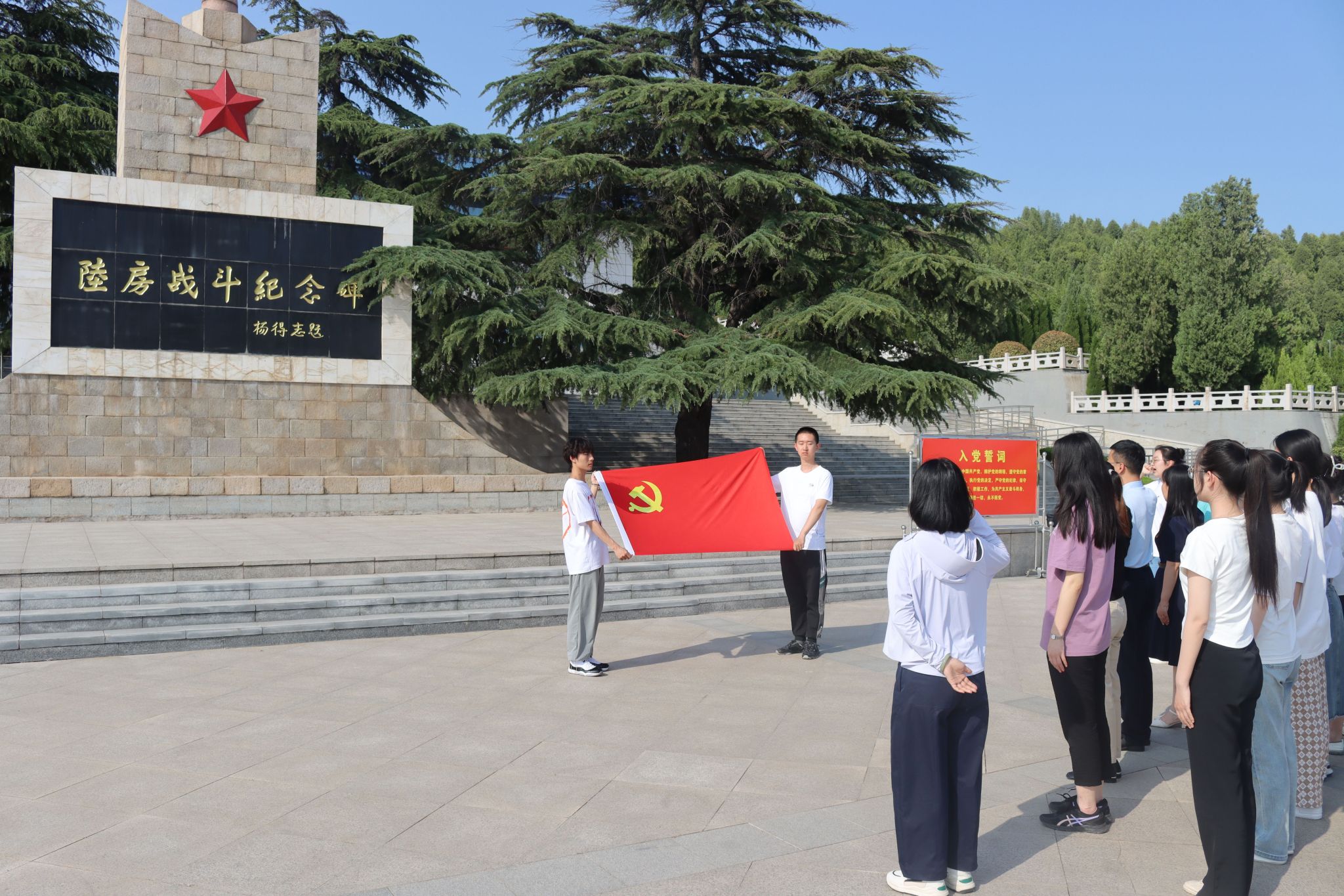 在陆房突围胜利纪念碑前,全体党员高举右手,面向党旗庄严宣誓,重温入党誓词,铮铮誓言里彰显出了共产党人的使命担当。