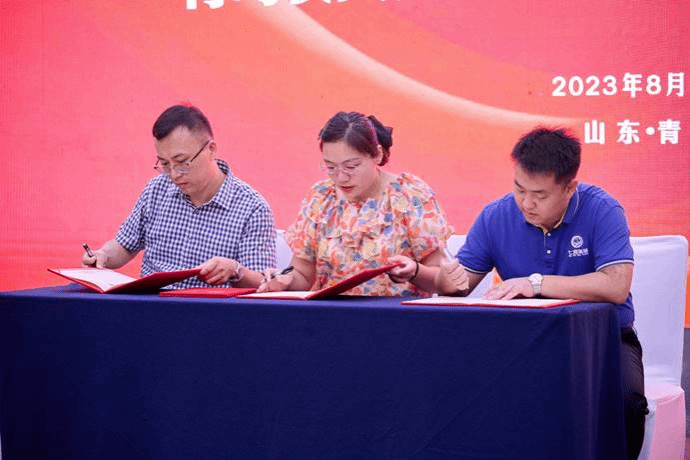 董灵芝代表公司分别与青岛慧致管理咨询有限公司、青岛七棵海草海洋科技有限公司现场签订教学实践基地协议;随后,杜江山、朱国辉、王磊共同为教学实践基地揭牌,并合影留念。
